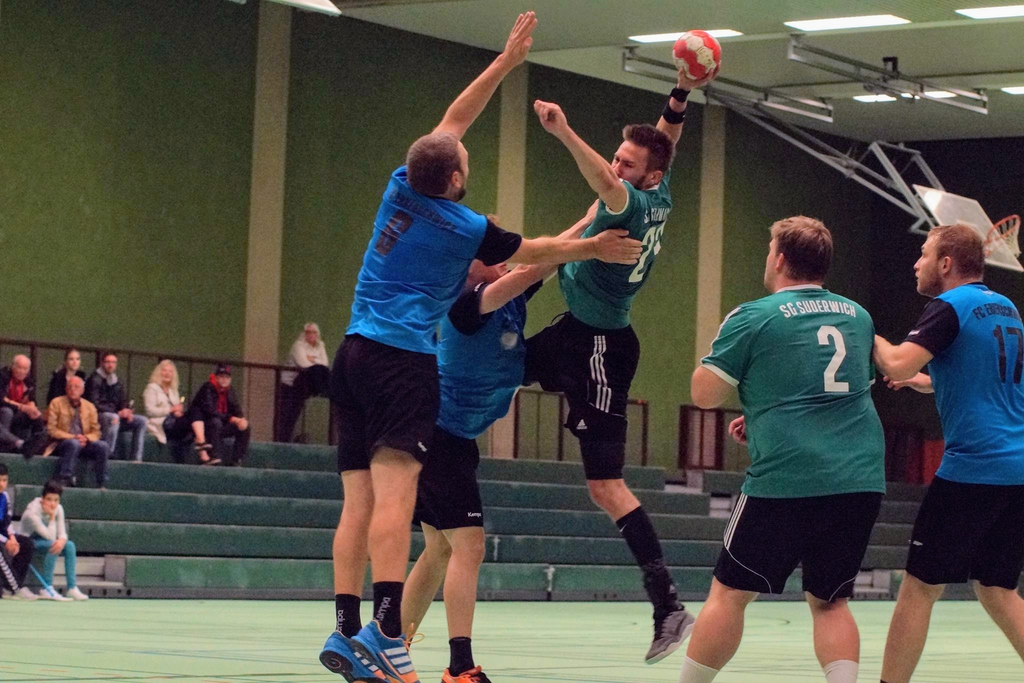 Die Ausgangslagen vor dem Spiel hatten sich in den letzten Wochen ein wenig verändert. Am eigentlich festgelegten Spieltermin im September grüßte der SV Teutonia Riemke 2 noch von der Tabellenspitze der Bezirksliga. Doch da machte das undichte Hallendach einer Austragung des Spiels einen Strich durch die Rechnung. Zwei Monate später fanden sich beide Mannschaften jetzt in unmittelbarer Nachbarschaft im Mittelfeld der Tabelle wieder. Dass sich beide Mannschaften auf Augenhöhe begegnen, zeigten schon die ersten Minuten des Spiels. Von Beginn an entwickelte sich ein enges und umkämpftes Spiel. Bis zum Stand von 3:4 (8.) legten zunächst die Gäste aus Bochum vor. Dann fand die SG Suderwich jedoch besser ins Spiel und drehte das Ergebnis. Drei Treffer am Stück sorgten für die 6:4 (12.) Führung. Auf mehr als zwei Tore konnte sich die Heimsieben jedoch in den nächsten Minuten nicht absetzen. Zu häufig ließ die von Alexander Gerdes betreute Mannschaft die berüchtigte Kaltschnäuzigkeit vor dem gegnerischen Tor vermissen. Der Gast aus Riemke blieb die ganze erste Halbzeit in unmittelbarer Schlagdistanz. Bis zur Pause konnte der SV sogar zum 12:12 ausgleichen.